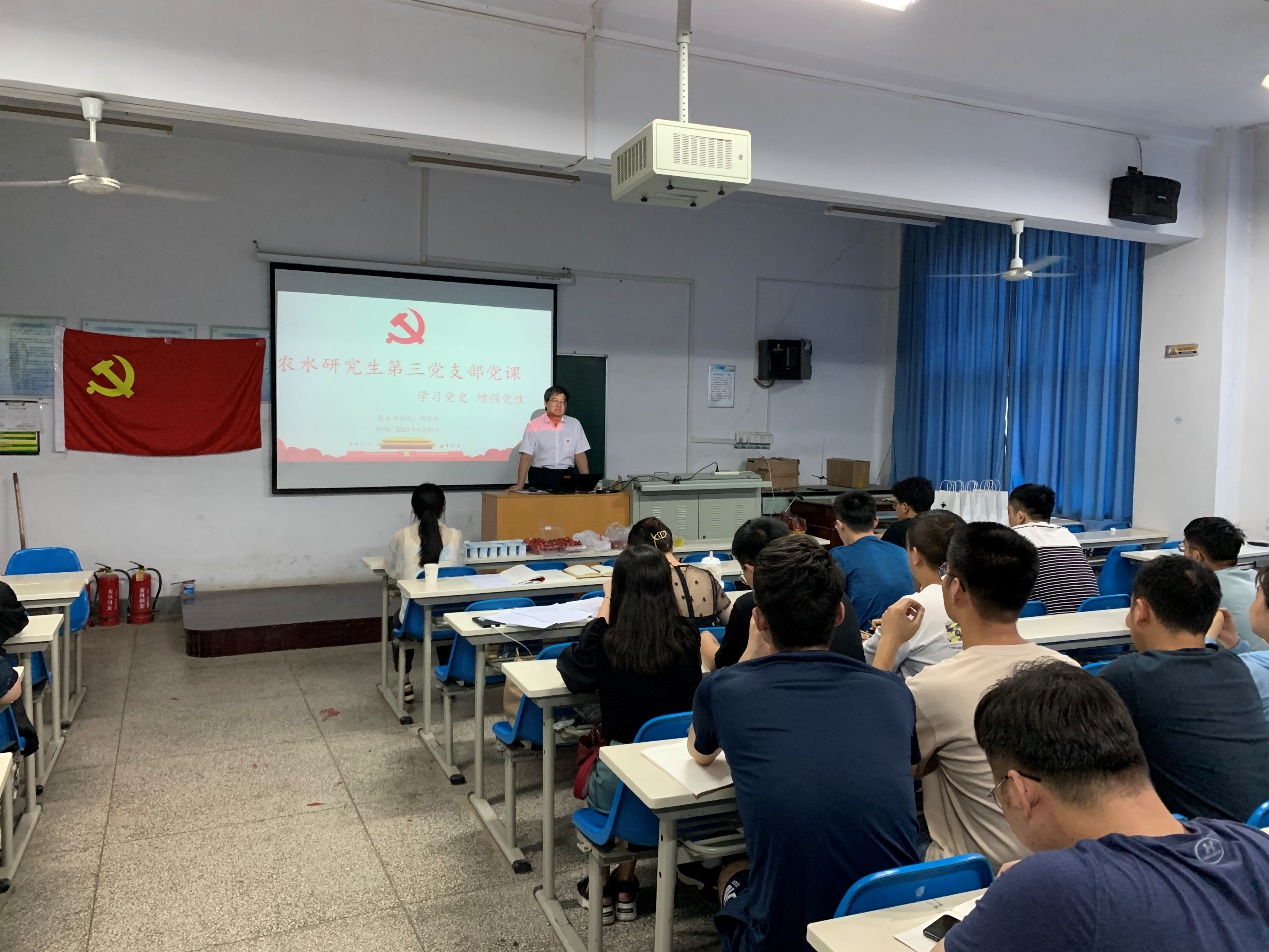 为加强四史学习教育,坚定四个自信,提高员工党员的思想政治理论水平,增强员工党支部凝聚力,6月21日晚,农水研究生第三党支部于5120教室开展书记讲党课暨毕业生党员欢送会,此次会议由支部书记胡笑涛主持并带领学习,农水研究生第三党支部全体党员参会。