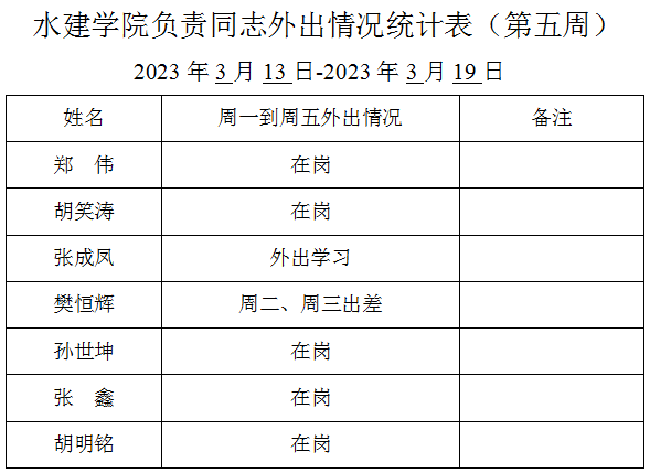 威廉williamhill体育负责同志外出情况统计表(第五周)