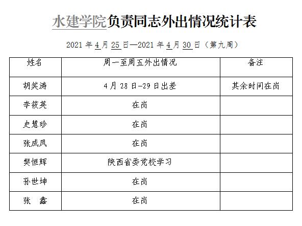 威廉williamhill体育负责同志外出情况统计表(第九周)