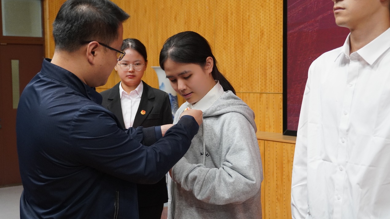 新团员入团仪式上,孟庆涛为新发展团员代表佩戴团徽,他指出,各团支部要坚定政治信仰,强化理论武装,密切关注团员青年的思想动态和工作生活需求,切实解决实际问题,为青年成长成才搭建平台、提供帮助,在日常生活中发挥团员的先锋模范作用。
