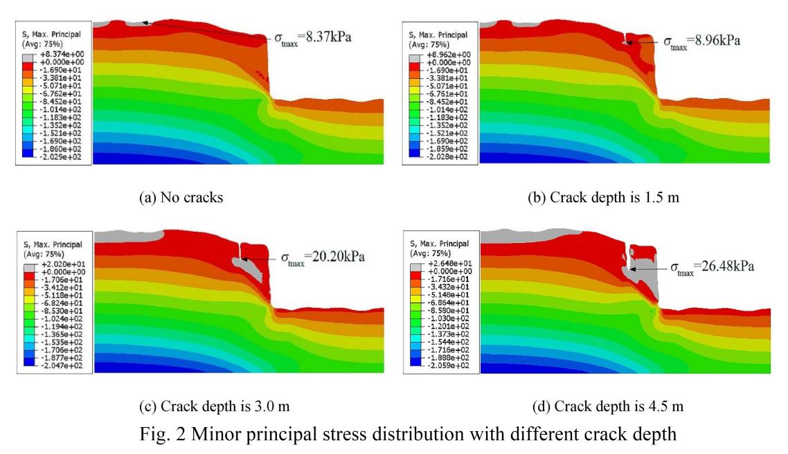 针对这一重大需求,侯天顺副教授团队揭示了降雨作用下裂缝深度和裂缝宽度对崩塌体稳定性的影响,以及崩塌体的失稳破坏机理。依托中国科公司水利部水土保持研究所长武黄土高原农业生态试验站,团队基于流固耦合原理和强度折减法,采用有限元方法对不同裂缝深度和裂缝宽度的崩塌体进行数值模拟计算,研究强降雨作用下裂缝对黄土崩塌的影响。研究结果表明,随着降雨的入渗,一方面使崩塌体自重增大,坡脚剪应力增大。另一方面,雨水从崩塌体外边缘渗出时会产生渗透力,增大崩塌体的倾覆力矩。裂缝深度逐渐增加的过程中,裂缝尖端拉应力值逐渐增大,崩塌体向临空面的倾倒趋势越来越明显,塑性区从坡脚逐渐延伸到了裂缝尖端处,崩塌体安全系数逐渐降低甚至小于1。随着裂缝宽度的增加,崩塌体重心逐渐外移,坡脚和裂缝尖端处土体变形逐步增大,崩塌体稳定性不断降低。